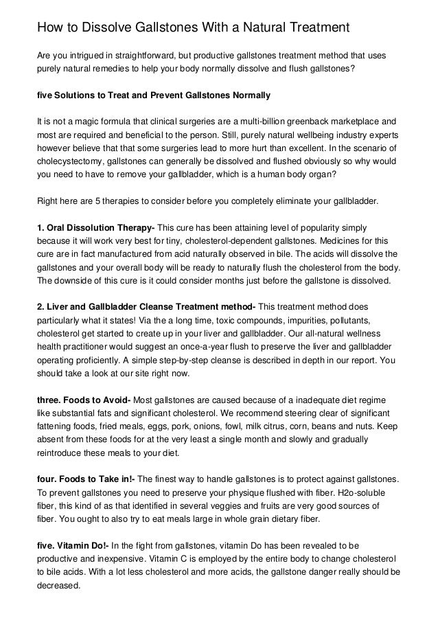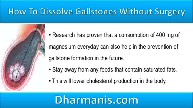 Gallstones are a sign that your body has 'decided' to increase its reservoir of cholesterol. But it may take months or years of treatment to dissolve how long does it take to recover from gallbladder surgery? One way to dissolve gallstones is to take a course of dissolution medication, which can be prescribed by your doctor. To discover the program that has helped thousands safely dissolve gallstones naturally be sure to visit the link above. How to heal your thyroid naturally. Gallstones are the stones or lumps inside the gallbladder. Is it possible to remove it naturally as prescribed give me valuable advice. Peppermint is a wonderful herb which contains a chemical that can dissolve gallstones, known as terpene. Gallstones may not be everyone's concern. Dissolving gallstones will allow you to save a lot on medical expenses, especially since the medical cost of the operation has gone up almost three times in the past ten years. Cholesterol stones form when liquid bile in the gallbladder contains more cholesterol than the bile salts can dissolve. Gallstones are hard pieces of material that can form in your gallbladder. When you consume too much cholesterol, compounds in the bile crystallize in the gallbladder, creating ascorbic acid converts cholesterol to bile acids.